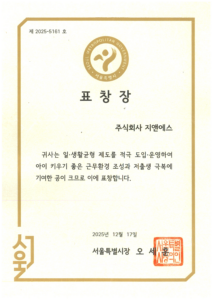 In recognition of our continuous efforts to enhance employee welfare and foster a corporate culture that prioritizes work-life balance, we have been awarded a Commendation from the Mayor of Seoul. This honor acknowledges our contributions to creating a workplace environment conducive to raising children and helping to overcome low birth rates.